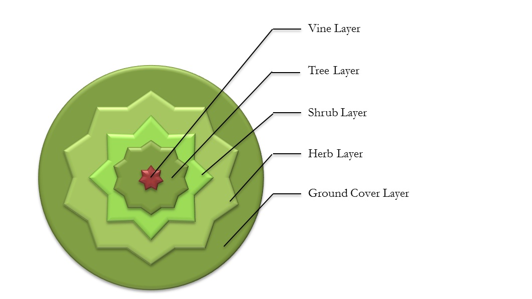 -In this type of garden you plant in “guilds” instead of rows. Guilds are like concentric circles of plants planted around the central plant of the guild, such as a fruit or a nut tree. Your shrubs are then planted around your tree, and your herbs are planted around your shrubs and ground cover is planted around that. (We will get into more detail in Chapter 5.)