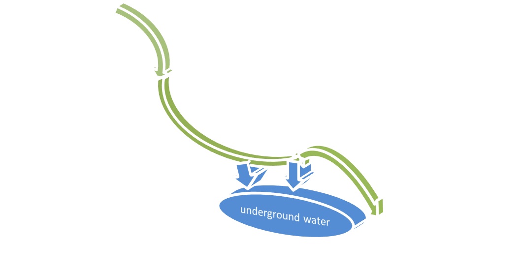 In permaculture, we use swales (berms and terraces) to store water. (See the illustration below.) When water drains down into the terrace, it is stopped from flowing further down-hill by the berm on the terrace. The water then seeps into the ground. A lens shaped pool of water forms under the berm. This water is available to the roots of the plants on the berm.